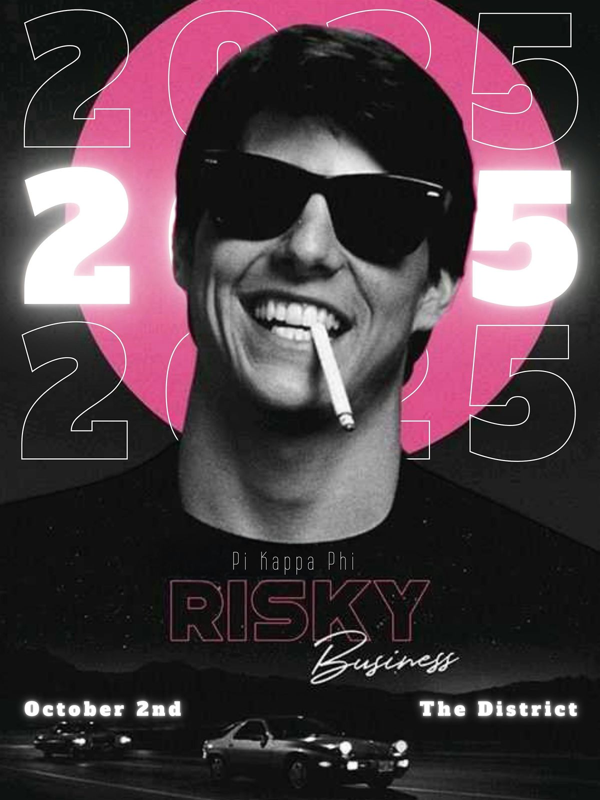 Get ready for the biggest event of the year! The Eta Delta chapter of Pi Kappa Phi is proud to announce Risky Business 2025! Come dressed in your best white button up and boxers and prepare for a night of music and partying that Tom Cruise himself wouldn’t miss!