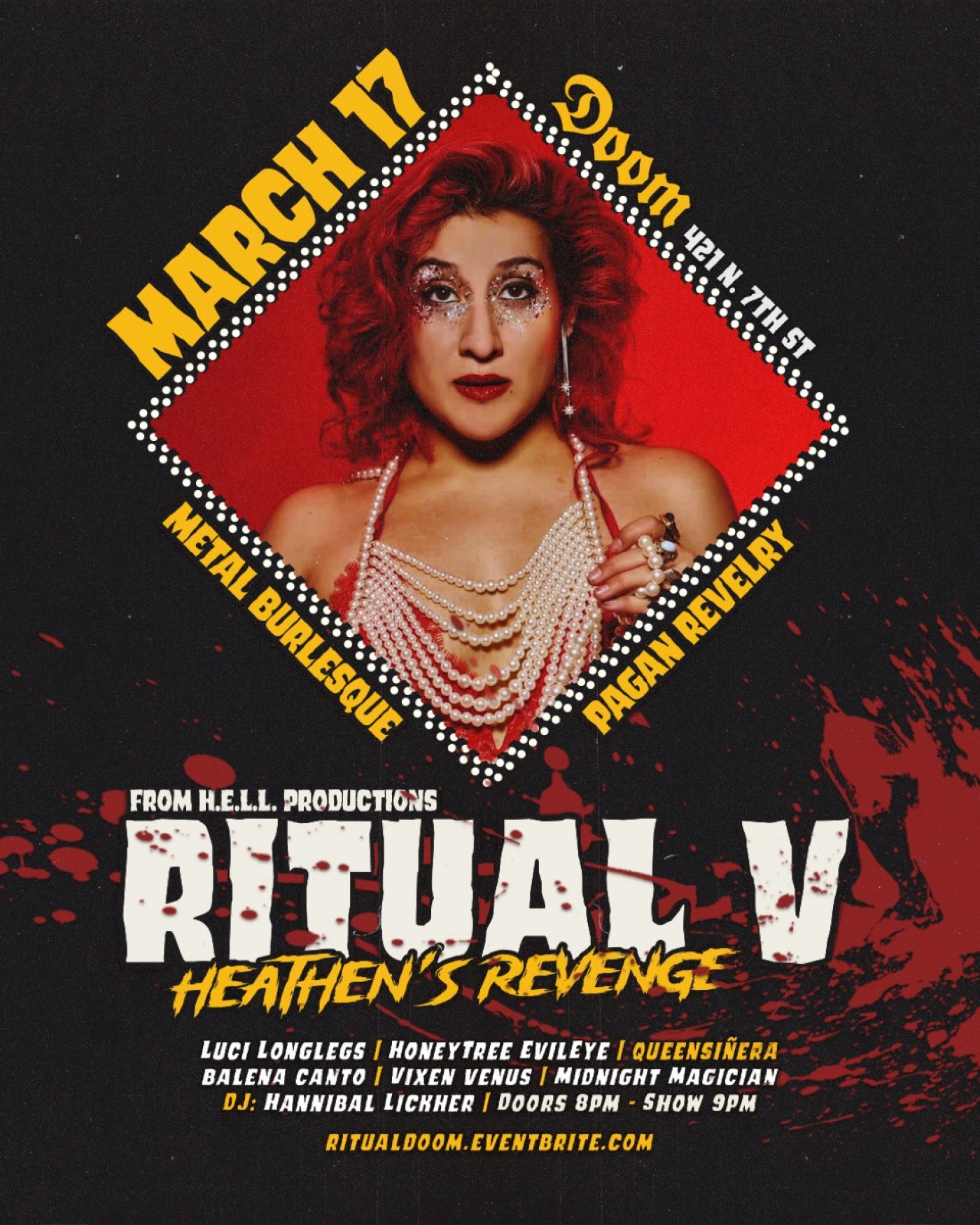 From HELL Productions (HoneyTree EvilEye & Luci Longlegs) present the 5th episode of Ritual, a night of metal burlesque and pagan revelry