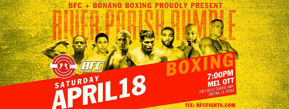 BFC + Bonano Boxing brings the heat to River Parish Rumble April 18—don’t miss a weekend of nonstop action and rising talent!About this Event