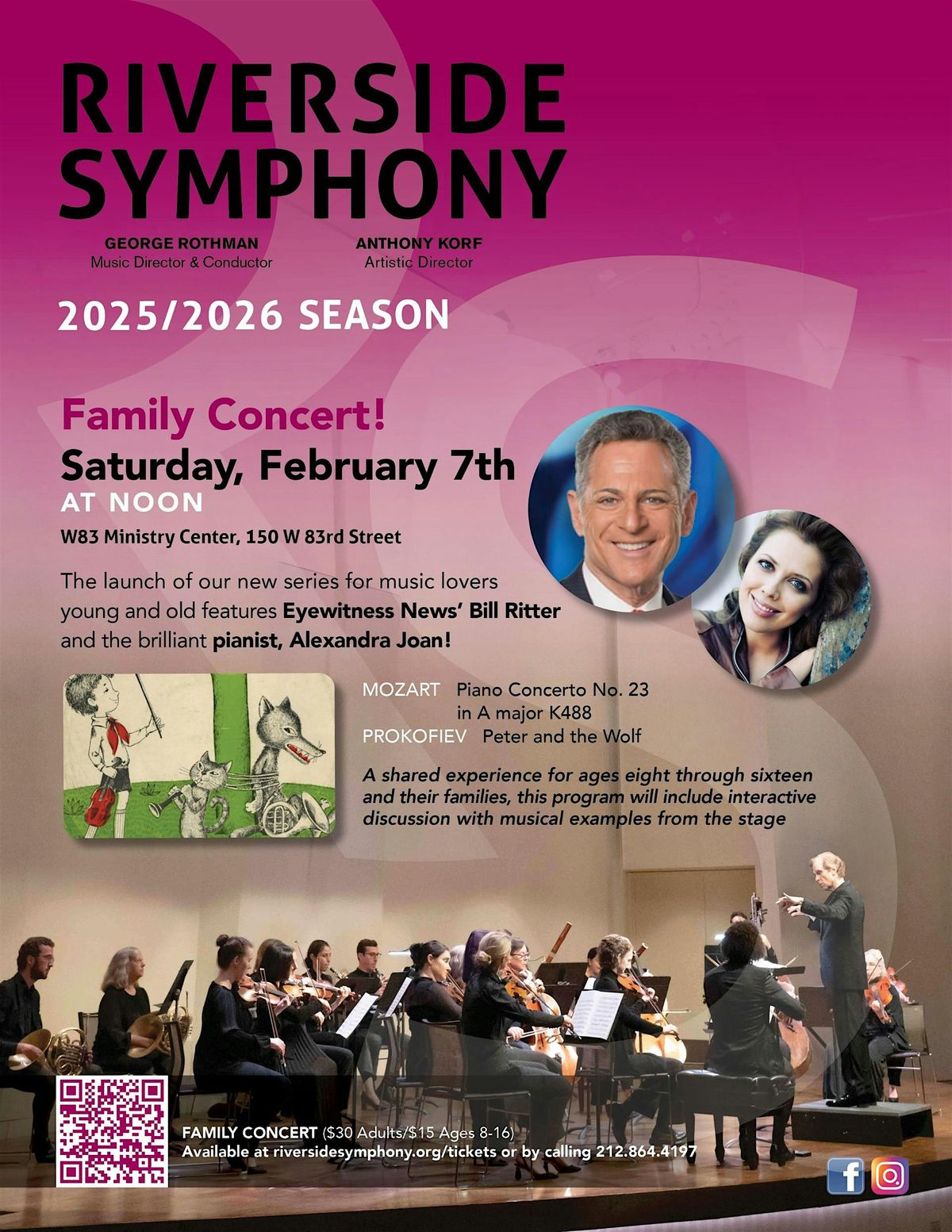 Don’t miss the launch of critically-acclaimed Riverside Symphony’s Family Concert Series, for music lovers eight and above! The Saturday afternoon program on February 7 will feature Eyewitness News anchor Bill Ritter narrating Prokofiev’s beloved Peter and the Wolf and Mozart’s Piano Concerto No. 23 with the dynamic Alexandra Joan. Designed for the shared experience of audiences aged eight and above, the program will include show-and-tell from the stage.