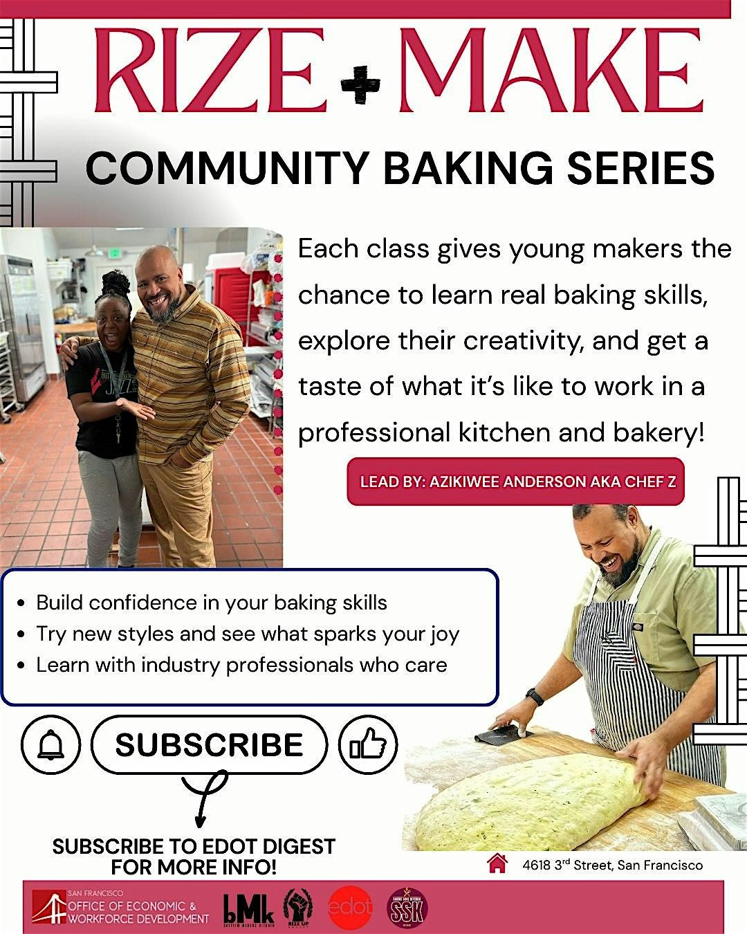Rize + Make is a hands-on baking series for youth ages 16–20 that introduces participants to the fundamentals of baking in a real working kitchen alongside Chef Z of Rize Up Bakery and industry professionals. Through guided instruction, youth will learn techniques such as mixing, shaping, and working with dough while building confidence, creativity, and comfort in the kitchen. The goal of the program is to give young people meaningful exposure to the culinary world so they can explore their interests, develop practical skills, and discover whether pursuing a career in baking or the kitchen is a path they’d like to follow.