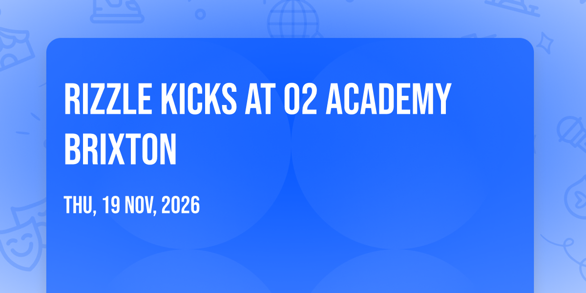β¨ Embark on an extraordinary journey at Rizzle Kicks at O2 Academy Brixton, where every moment promises to be unforgettable! π Imagine of transforming O2 Academy Brixton in the heart of London, EN into a realm of endless possibilities. π Join us on November 19th, 2026 at 07:00 PM for an experience that will challenge your imagination and exceed your expectations. π― This carefully curated event combines the finest elements of entertainment, innovation, and community spirit. Whether you're an adventure seeker, culture enthusiast, or someone looking for unique experiences, this event offers something special for everyone. π Don't miss this chance to be part of something extraordinary!