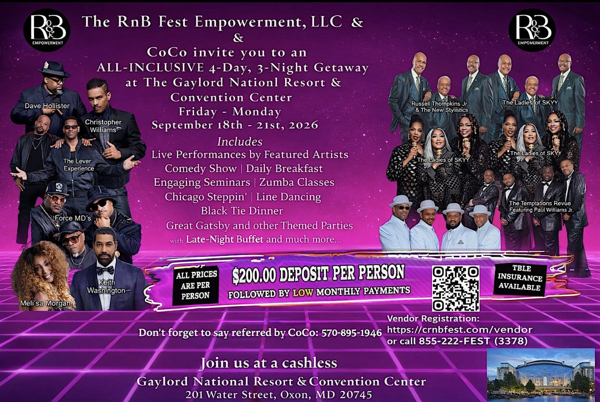 The RnB Fest Empowerment is an all-inclusive 4-day, 3-night luxury getaway celebrating music, culture, and empowerment at the stunning Gaylord National Resort & Convention Center. Guests will experience electrifying live performances by legendary R&B artists, soul-filled concerts, and an unforgettable comedy show.