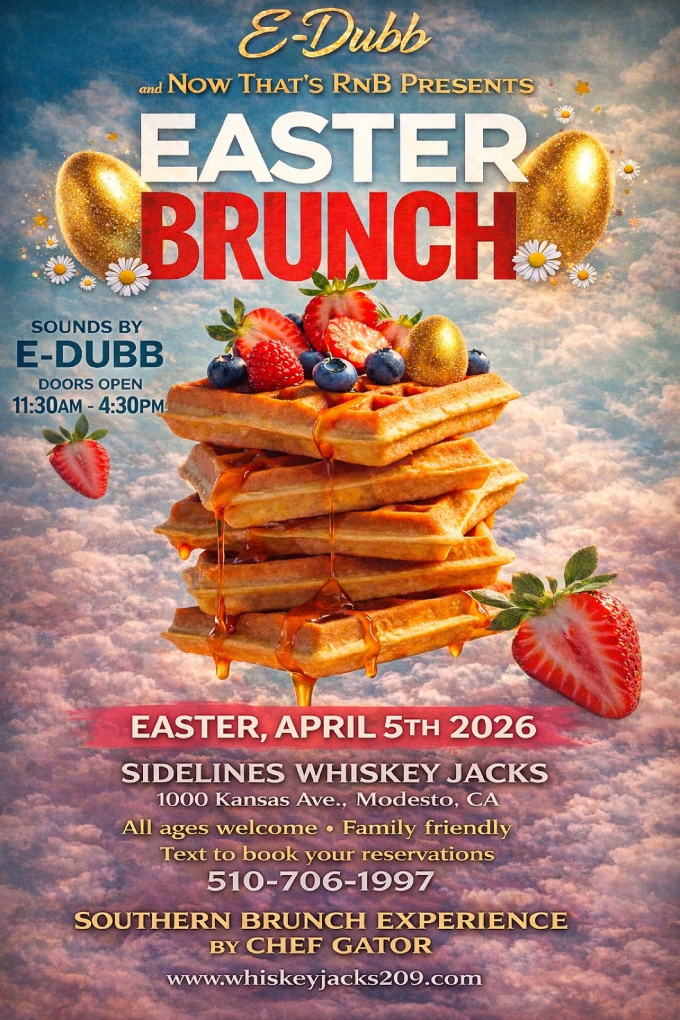 Modesto California are you ready? I say #209 are you ready? Central Valley please welcome celebrity chef, “Chef Gator” and his healthy southern cuisine to Sidelines Whiskey Jacks for an incredible RnB Sunday Brunch Easter addition, this is a family friendly brunch. All ages are welcome doors open at 11:30am & we close at 4pm. No entry fee or reservation fee. Just call or text to book your table reservation now 510 706-1997