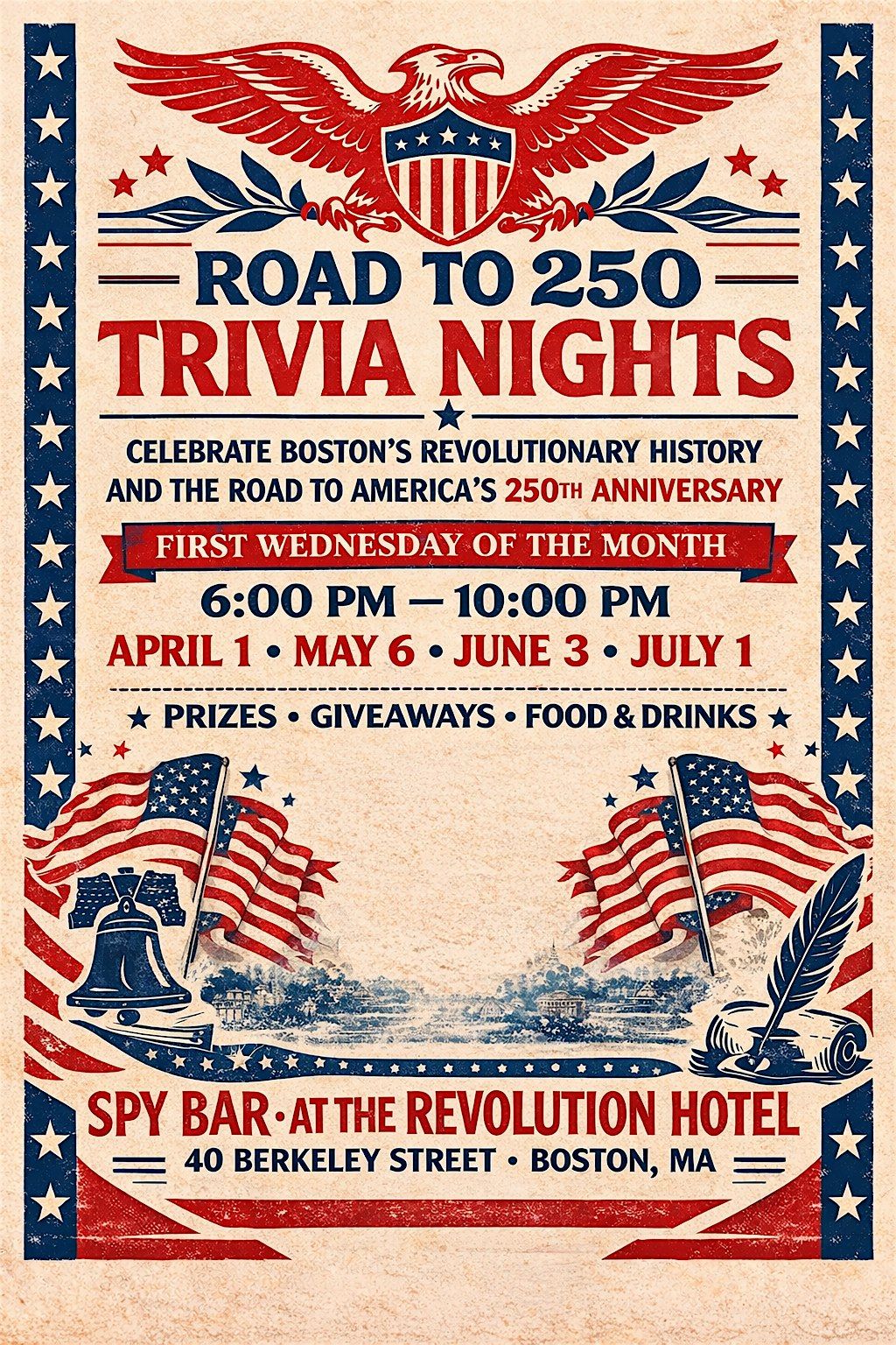 Join us at Spy Bar at The Revolution Hotel for Road to 250 Trivia Nights, a monthly series celebrating Boston’s revolutionary spirit, local culture, and the road to America’s 250th anniversary.
