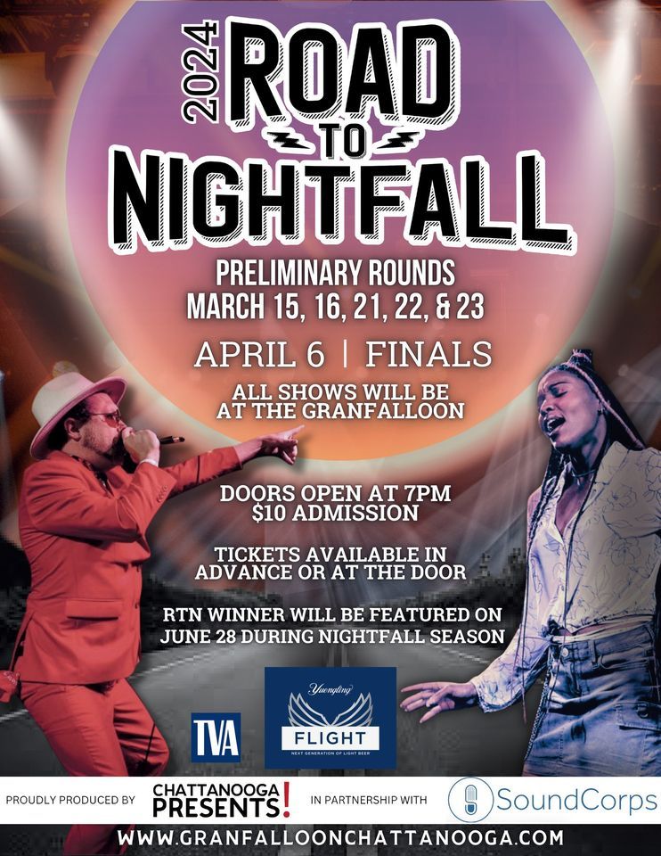 Chattanooga Presents & SoundCorps announce a full schedule of bands performing at The Granfalloon March 15-23 at the Road to Nightfall 2024 band competition, made possible by Yuengling Flight.Thirty bands will perform over five nights at the Granfalloon, 400 East Main St. Six bands will perform each night with five finalists competing in the Finale Night on April 6. The series winner earns the opportunity to headline Nightfall on June 28, 2024.
