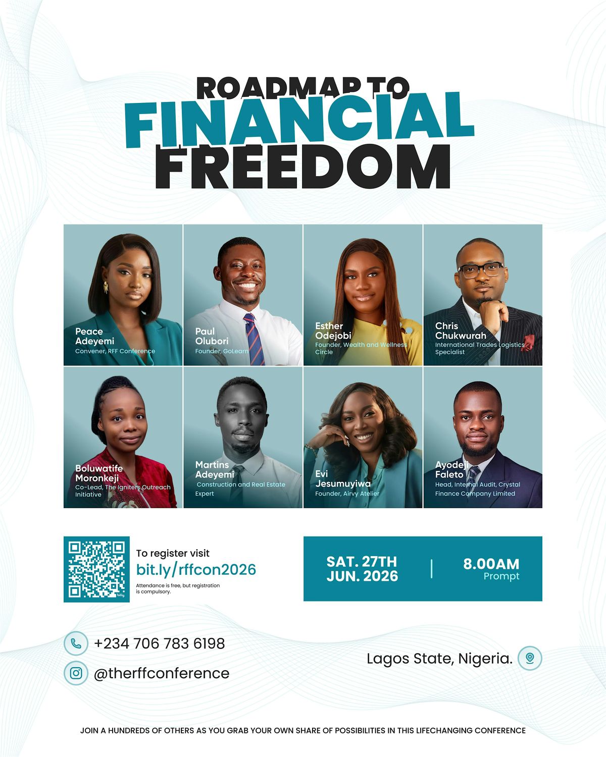 Welcome to the Roadmap to Financial Freedom Conference happening in Lagos! Join us on June 27, 2026 at 8:00 AM (West African Time) for a day filled with valuable insights and strategies to help you achieve financial independence. Whether you're just starting or looking to level up your financial game, this event is perfect for you. Get ready to learn from industry experts, network with like-minded individuals, and take your first step towards a brighter financial future. Don't miss out on this opportunity to pave your way to financial freedom because it's not just business as usual, be ready to be fully equipped to start your abundance journey.