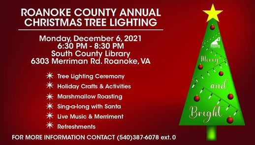 Roanoke County officials invite the community to join together to begin the holiday season with a ceremonial Christmas Tree lighting on Monday, December 6 at the South County Library.This year’s theme “Merry and Bright” will feature entertainment, crafts, activities and special attractions that will help to make the evening merry and bright! The event kicks off with a ceremonial tree lighting at 6:30 PM and Christmas carols led by song-leader Rebecca Ventola of the Library staff.