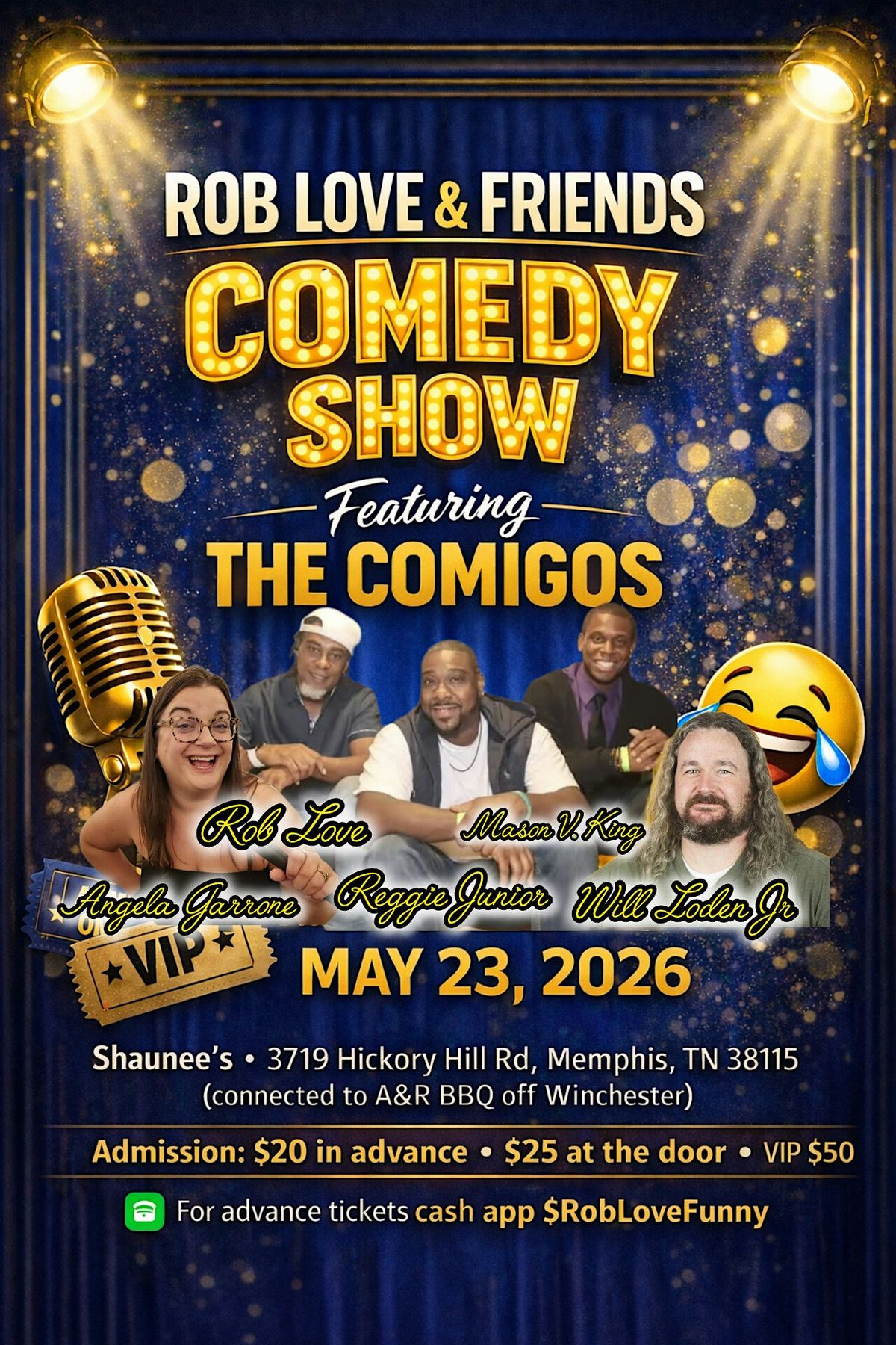 Get ready for a night full of laughs at the Rob Love and Friends Comedy Show, featuring the hilarious Comigos (Reggie Junior and Mason V King) with Will Loden Jr and Angela Garrone! This is an in-person event where good vibes and big laughs are guaranteed. Bring your friends, enjoy great food and drinks, and some of the best comedy around. Don't miss out on an unforgettable evening Love and Laughs!