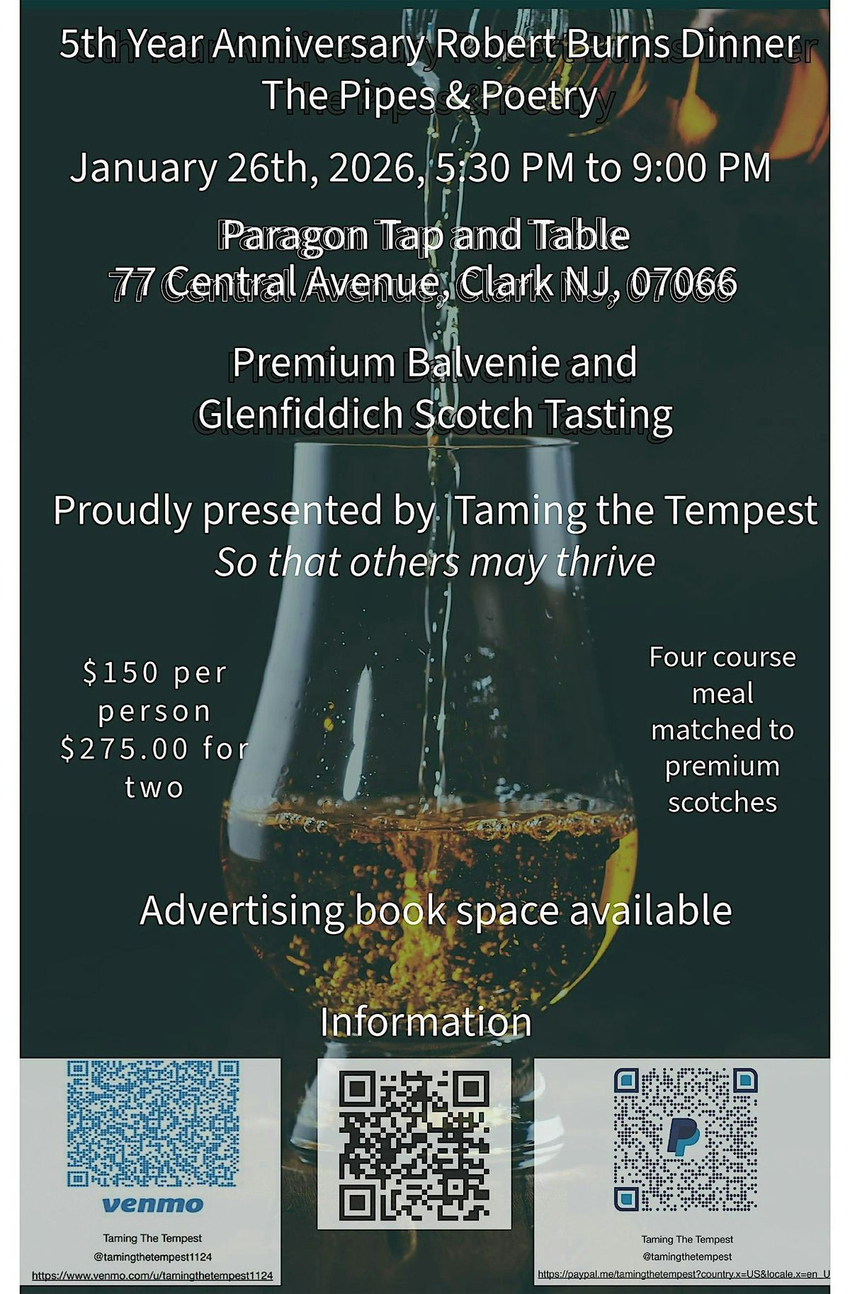 Welcome to the Robert Burns Dinner & Premium Scotch Tasting! Join us at Paragon Tap & Table for an evening celebrating the life and poetry of Scotland's beloved bard, Robert Burns. Indulge in a traditional Scottish feast while savoring a selection of premium Scotch whiskies carefully curated for this special event. Immerse yourself in the rich culture and heritage of Scotland as we raise a glass to one of its most iconic figures. Don't miss out on this unique opportunity to experience a taste of Scotland, the pipes, and poetry all while supporting Taming the Tempest.