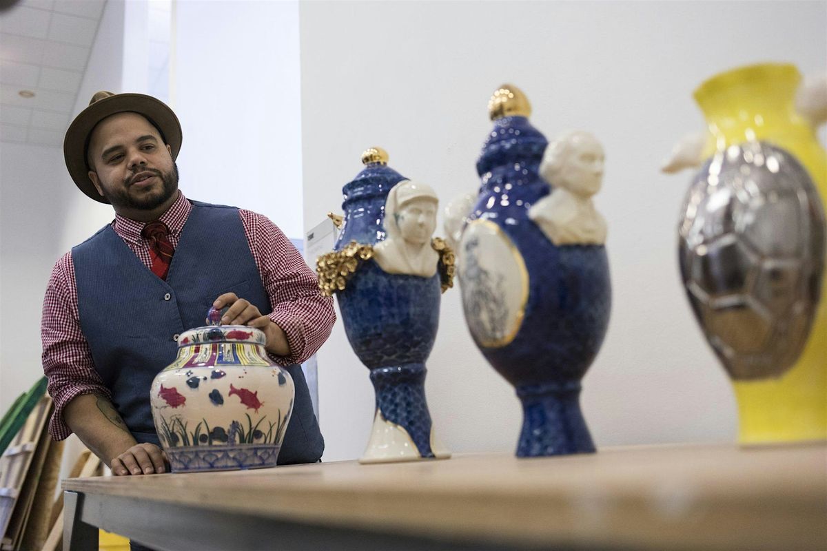 Join us in person for an exciting Gallery Walk and Talk with the amazing Roberto Lugo! Dive into his world, get up close with his stunning work, and hear all about his creative journey. It's a chance to explore art, ask questions, and enjoy a laid-back vibe. Don’t miss this unique opportunity to connect with the artist and see his pieces like never before!