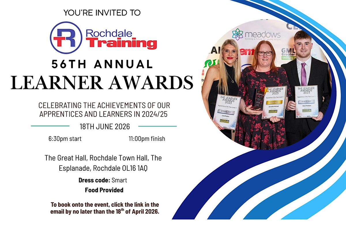 The Learner Awards 2026 will take place on Thursday 18th June 2026 at the Rochdale Town Hall. This prestigious event will celebrate the achievements of our learners with a night of networking, food and entertainment.
