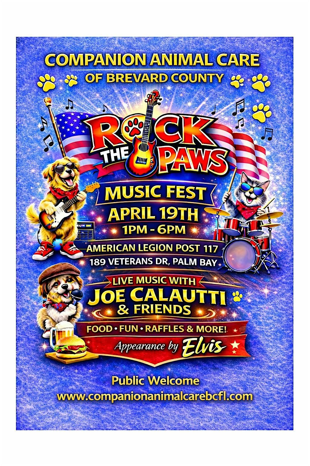 Celebrate with Companion Animal Care at their annual fundraising event! Music by Joe Calautti and friends, food, raffles, auctions, vendors, an appearance by Elvis and so much more! Help us ROCK THE PAWS at the American Legion Post 117 in Palm Bay from 1p-6p, Sunday April 19th.