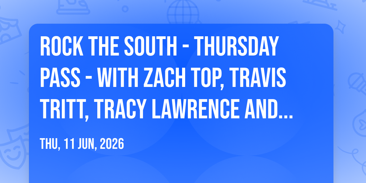 📍 Location: 33.7748, -84.2963✨ Enter a world of endless possibilities at Rock The South - Thursday Pass - with Zach Top, Travis Tritt, Tracy Lawrence and more, where every moment tells a story! 🏛️ The stunning The Fields at Decatur in vibrant Decatur, GA transforms into a realm of wonder on June 11th, 2026 at 07:30 AM. 🌟 They have crafted an experience that goes beyond the ordinary, combining elements of surprise, delight, and pure entertainment. Every detail has been thoughtfully considered to ensure your journey with us is nothing short of extraordinary. 🎯 Join fellow adventure seekers and memory makers in this celebration of imagination and innovation. 🎊 Reserve your spot today and be part of something truly special!