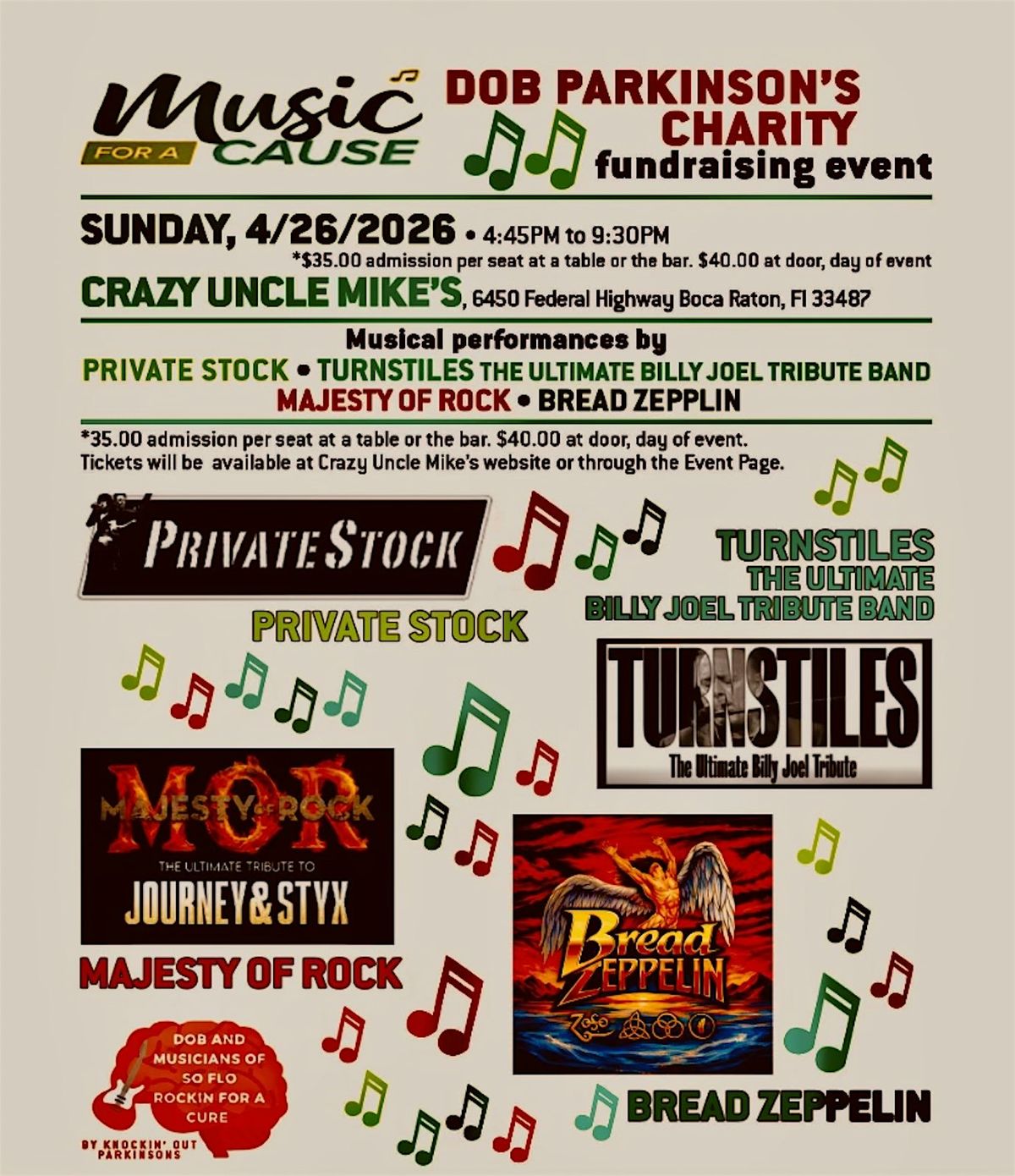 The Charity will work directly with participating medical providers and vendors, i.e., Holy Cross Hospital, Dr. Physiotherapy and Wellness. From our mission, the event D O B and Musicians of So Flo Rockin' for a Cure by Knockin' out Parkinson's was born! We're moving forward with our fourth event scheduled for April 26th, at Crazy Uncle Mike's in Boca Raton Florida!