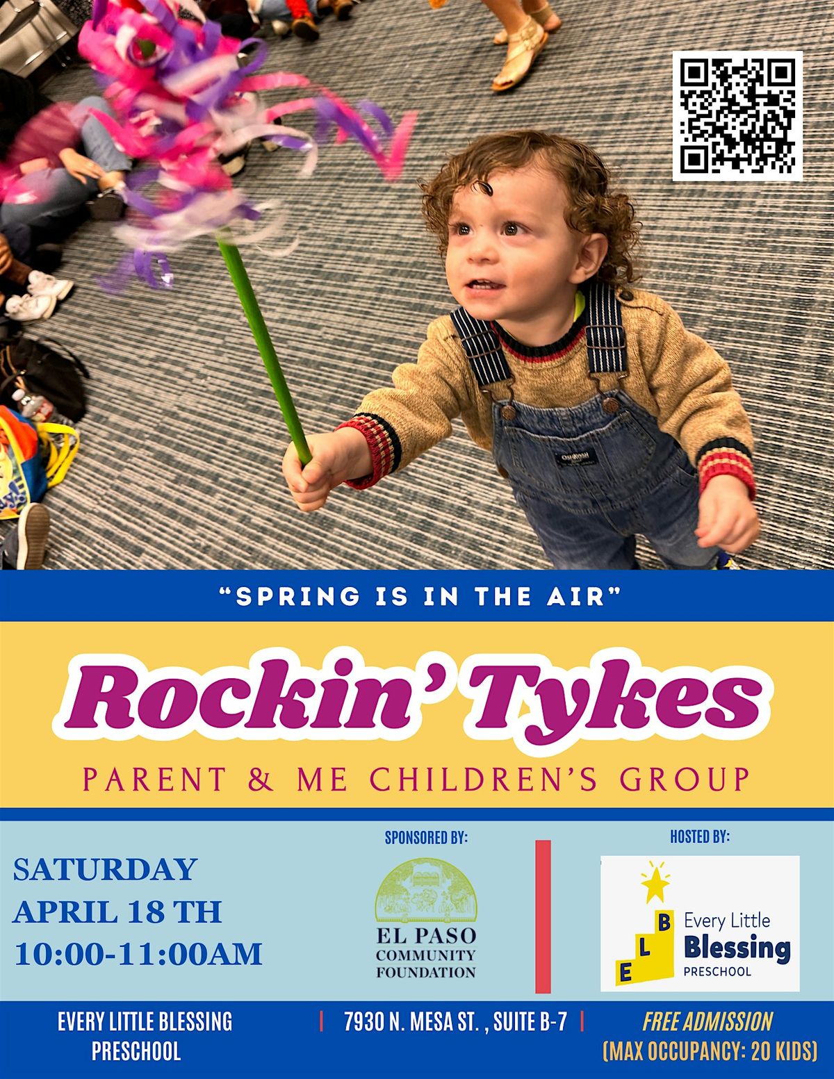 Tickets for this event are sponsored by the El Paso Community Foundation, and are therefore FREE - ONLY the PARTICIPATING CHILD needs a ticket for Rockin' Tykes. Every child must be accompanied by an adult who will be participating with them throughout the entire hour-long session. Event is targeted to participants 18 months to 5 years of age, though some younger and slightly older kids have also been known to enjoy the activities. Attendance will be capped at 20 children.
