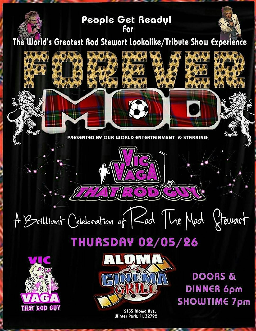 This is dinner show seating so get your tickets in advance to secure your seats. VIP sells out fast so get your tickets NOW! Join us for Rod Stewart Tribute "Forever Mod" LIVE at Aloma Cinema Grill!
