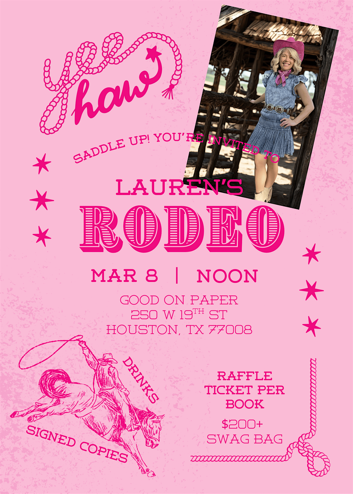 Join us as we work with Lauren Catching, local thriller and western author, for a rodeo-themed popup table! Buying one of Lauren's books will automatically enter you in her raffle for a rodeo swag bag with contributions from Emerson Rose and Lily Rain! Book stock is limited, so be sure to get here early. Yeehaw!