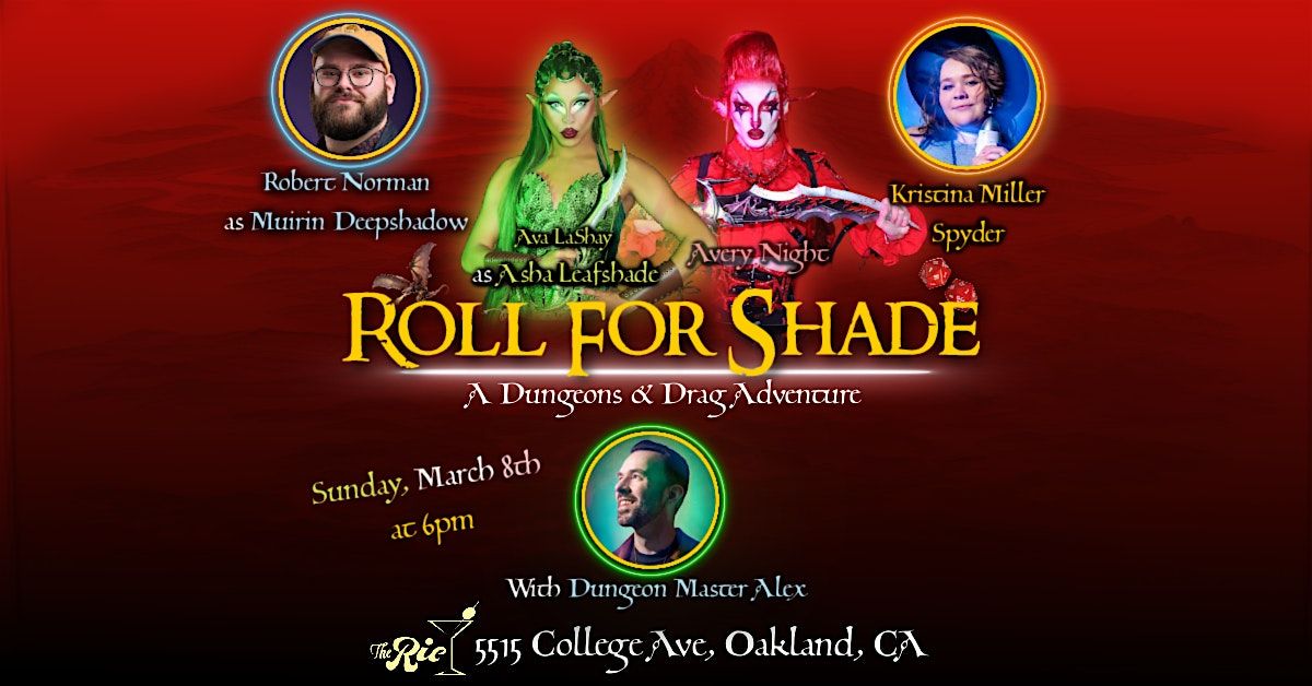Roll for Shade is a Dungeons & Dragons live play show - half improv and half dice rolls! Two drag queens and two hilarious experienced players try to navigate their way through Oakfen, a fantasy version of Oakland, all while uncovering a growing tech conspiracy!