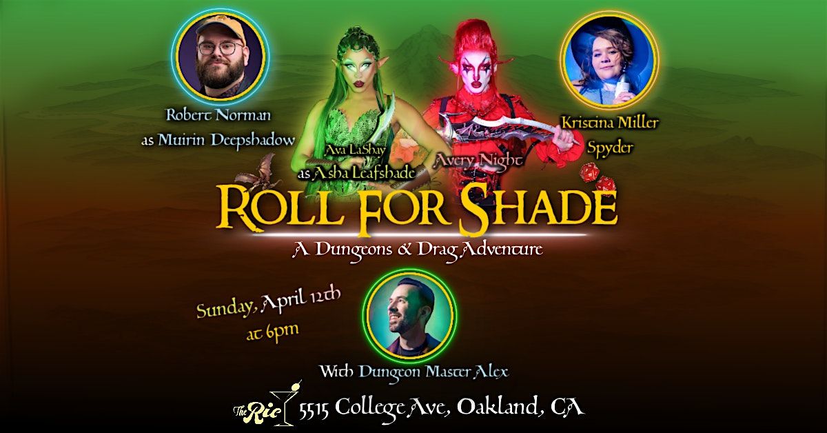 Roll for Shade is a Dungeons & Dragons live play show - half improv and half dice rolls! Two drag queens and two hilarious experienced players try to navigate their way through Oakfen, a fantasy version of Oakland, all while uncovering a growing tech conspiracy!