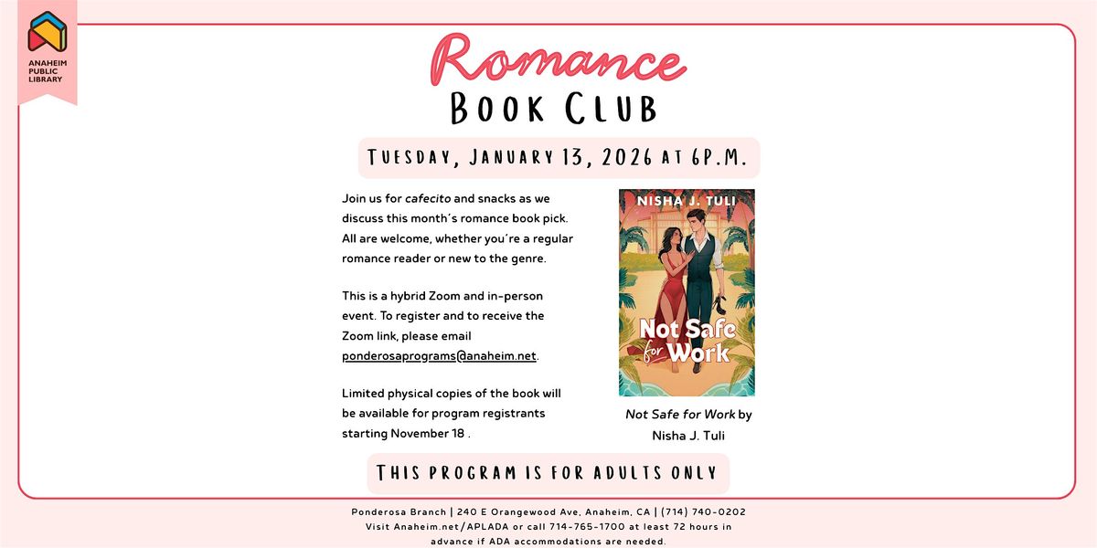 Join us for cafecito and snacks as we discuss this month’s romance book pick.About this Event