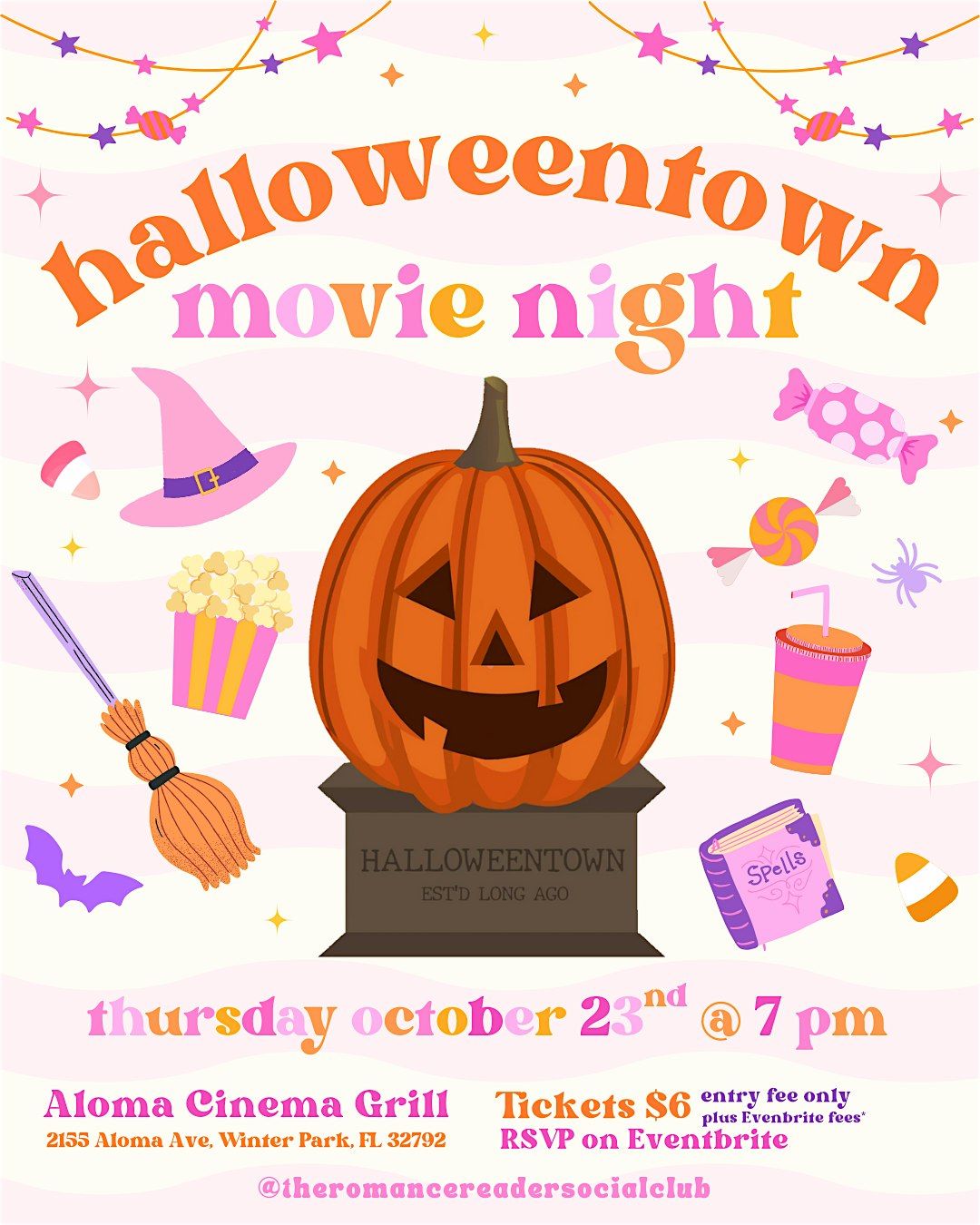 🎬 Halloweentown starts at 7:00 PM — please arrive by 6:45 PM to get settled and order food
