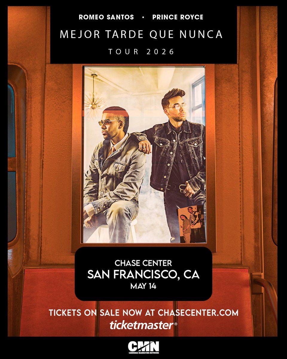 Romeo Santos at Chase Center🌟 Be part of history at Romeo Santos & Prince Royce San Francisco Tickets, an extraordinary gathering that will captivate your imagination! 🏛️ The prestigious Chase Center in San Francisco, CA sets the stage for an unforgettable experience on May 14th, 2026 at 08:00 PM. ✨ They are bringing together the finest elements of entertainment and innovation to create moments that will take your breath away. From the moment you arrive, you'll be immersed in an atmosphere of wonder and excitement. 🎯 This carefully planned event ensures every guest experiences something truly special. 🎫 Get your tickets at 79.87 EUR. 🎊 Early booking is recommended for this must-attend event of the season!