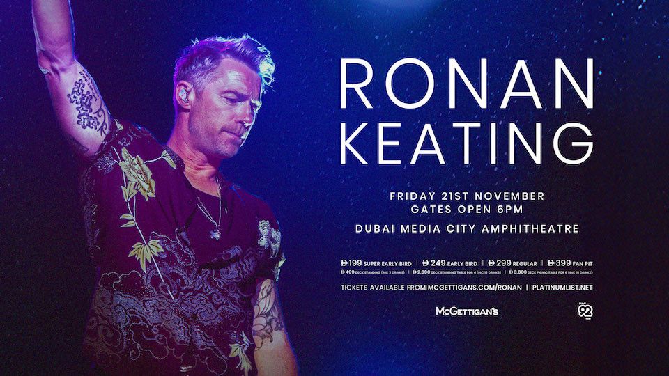 Enjoy an unforgettable evening under the stars with Irish pop star Ronan Keating and his band live on stage at the stunning Dubai Media City Amphitheatre, the city’s favourite concert venue.