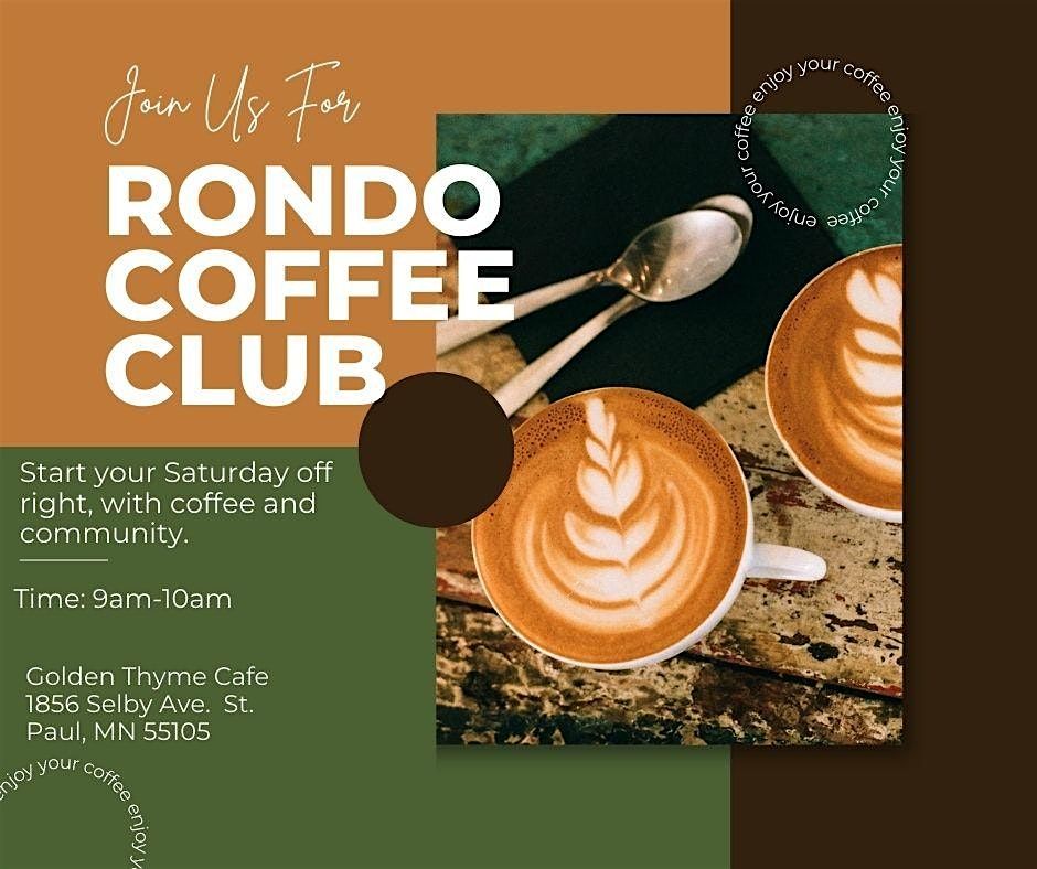 Welcome to the Rondo Coffee Club at Golden Thyme Cafe on February 14, 2026 at 9:00 AM! ☕️ Join us for a cozy morning filled with delicious coffee, good company, and great conversations. Whether you're a coffee aficionado or just looking for a communal start to your day, this event is perfect for you. No agenda, No pitch -- Just genuine conversations, shared experiences and a chance to build relationships. Mark your calendars and we can't wait to see you there!