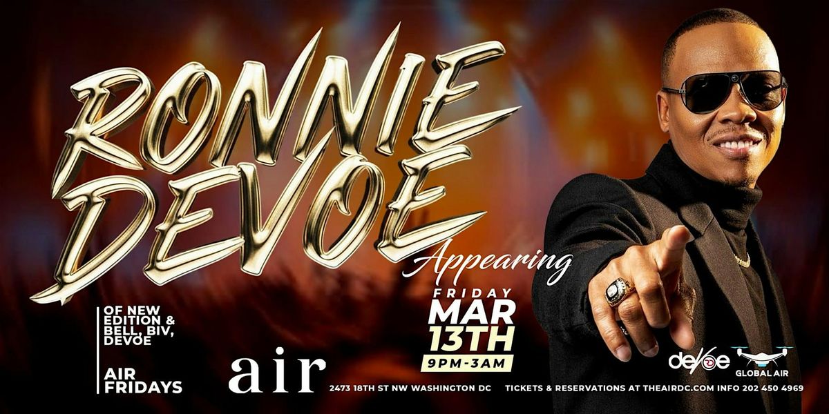 Get ready to vibe with Ronnie Devoe as he takes over the night in person! Join us for an unforgettable evening filled with great music, cool vibes, and good company. Whether you're looking to dance or just chill, Air Friday Nights is the place to be. Don’t miss out on the fun—come hang out and make the weekend kick off right!