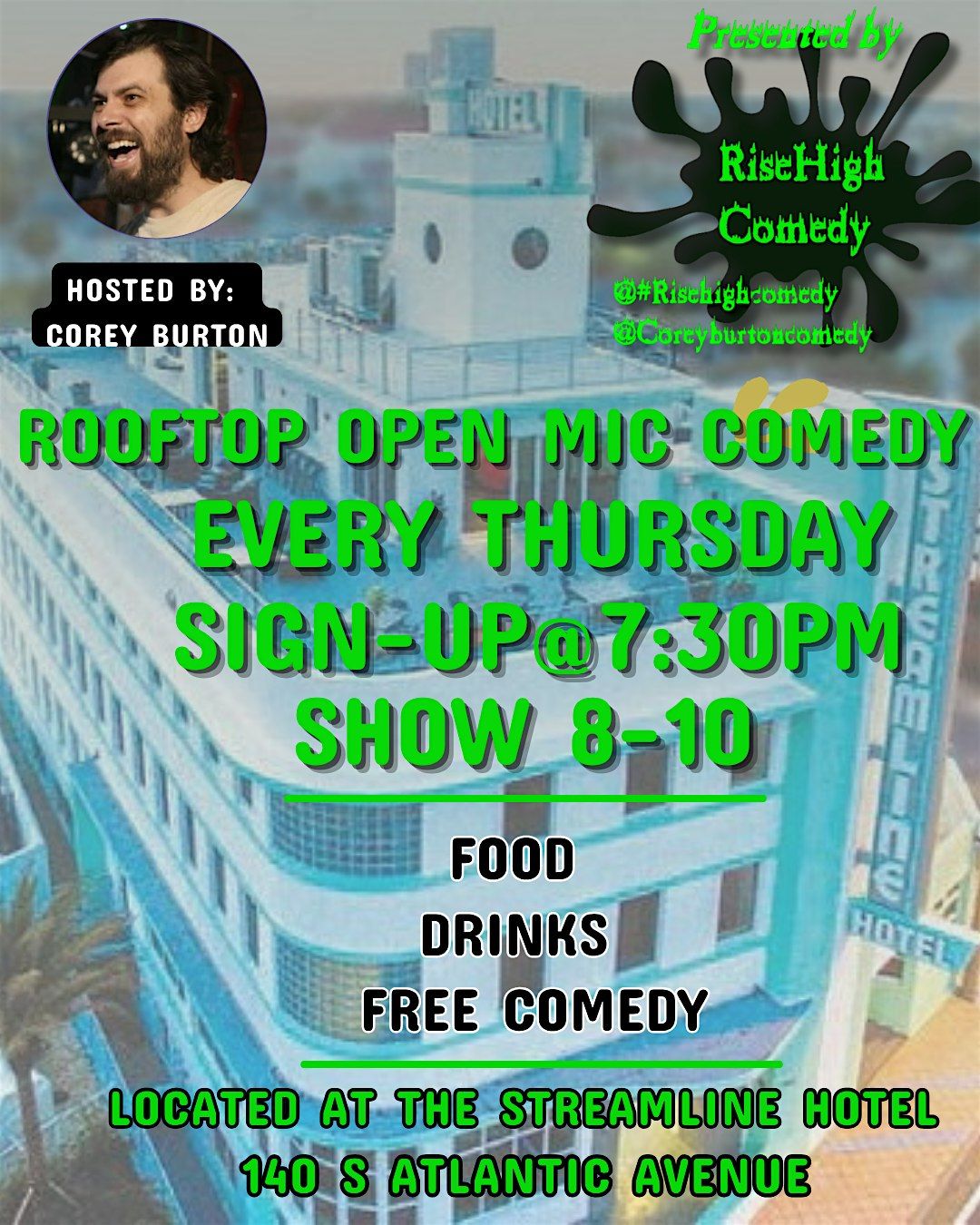 Every Thursday! Join us ON THE ROOF for open mic comedy! All comics welcome to sign up for your 5 minutes!