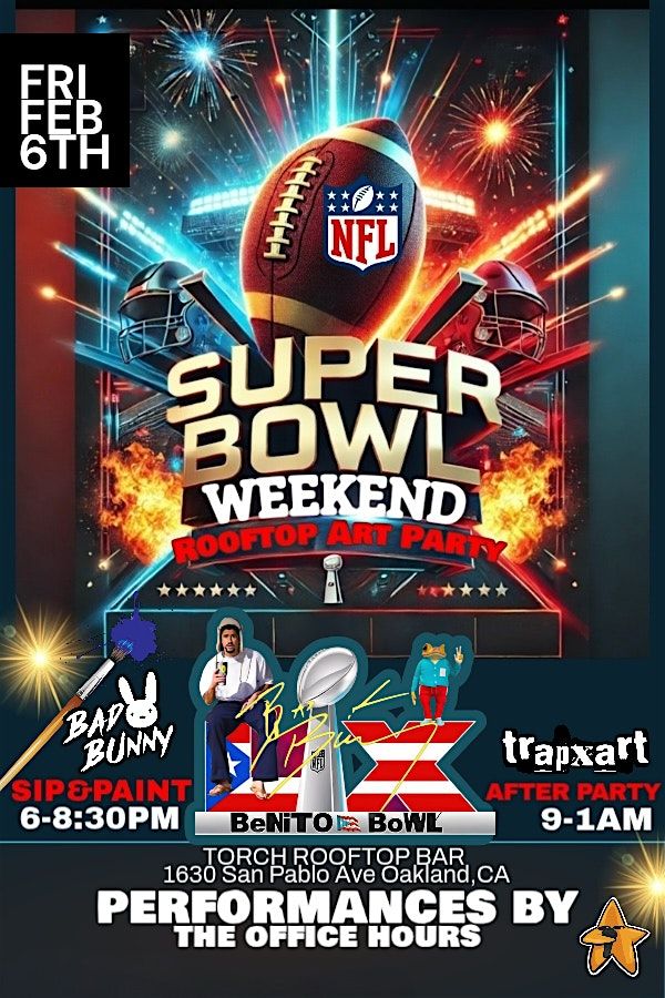 Welcome to the Rooftop Sip&Paint Super Bowl Art party at Torch Oakland Rooftop Bar! Get ready for a fun evening filled with creativity and football vibes. Join us on February 6, 2026 at 6:00PM for a unique experience. Grab a drink, pick up your paintbrush, and let your artistic side shine under the stars. It's the perfect way to celebrate the Super Bowl in style. Don't miss out on this exciting event! See you there!