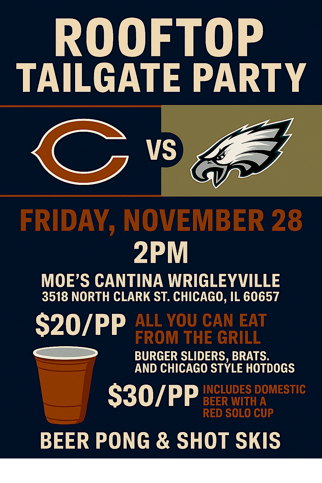 Get ready for the ultimate game day rooftop experience in Wrigleyville! Join us at Moeโs Cantina for unbeatable views, tailgate vibes, and all-you-can-eat grill favorites as the Bears take on the Eagles.