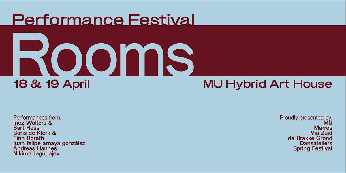 ROOMS Performance Festival takes place on Saturday 18 and Sunday 19 April 2026 at MU Hybrid Art House in Eindhoven. The program is the same on both days, and a day pass provides full access to all five performances spread throughout the day.
