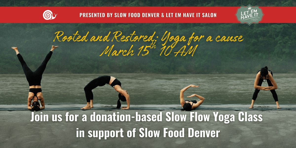 Join us for a grounding slow flow yoga class in support of Slow Food Denver, hosted at Let Em Have It Salon. This all-levels class is an opportunity to move your body, connect with the community, and support equitable access to good, clean, and fair food.