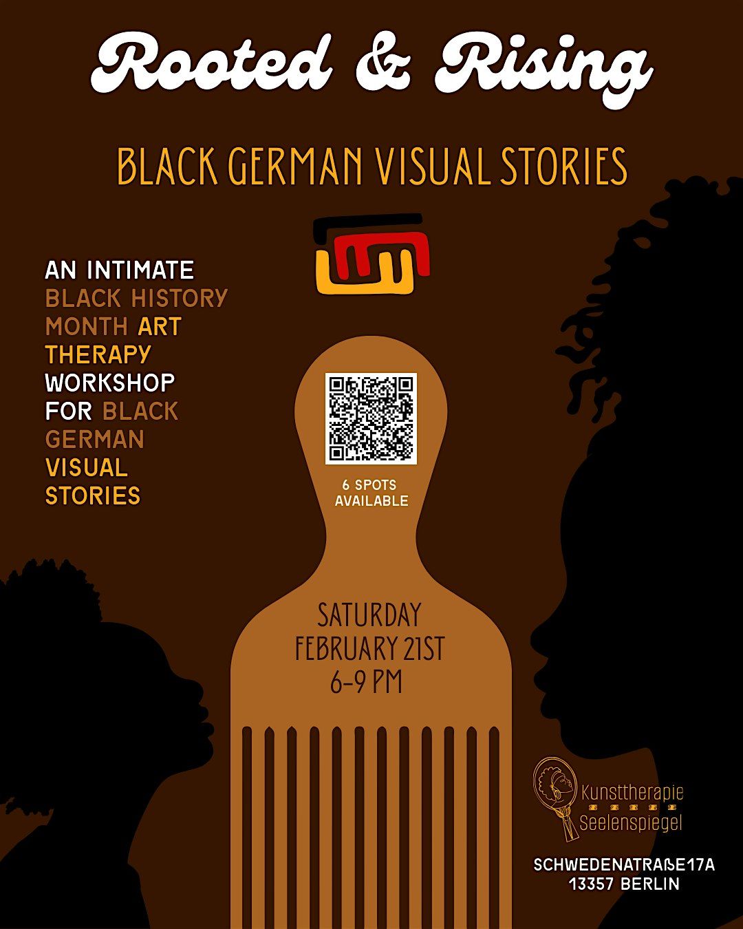 "Rooted & Rising – Black German Visual Stories" is an intimate art therapy workshop held in honor of Black History Month for people who identify as Black Germans. In the Black-owned studio space "Kunsttherapie Seelenspiegel" (owned by Black German artist and art therapist Charlene Davis), participants are invited to create their own visual story. This may be inspired by a formative moment, a memory, a feeling, a symbol, a person, a name, or an object, anything connected to personal experiences of being Black and German. The focus is not on artistic skill or performance, but on expression, self-reflection, and making personal narratives visible. The resulting artworks may be abstract, fragmentary, or clearly narrative, all forms are welcome. The workshop offers space for quiet reflection, creative work, and shared presence in community. All materials are provided, and no prior artistic experience is required. This is a deliberately POC-only space, created to hold, share and honor Black German stories from within our own perspectives.