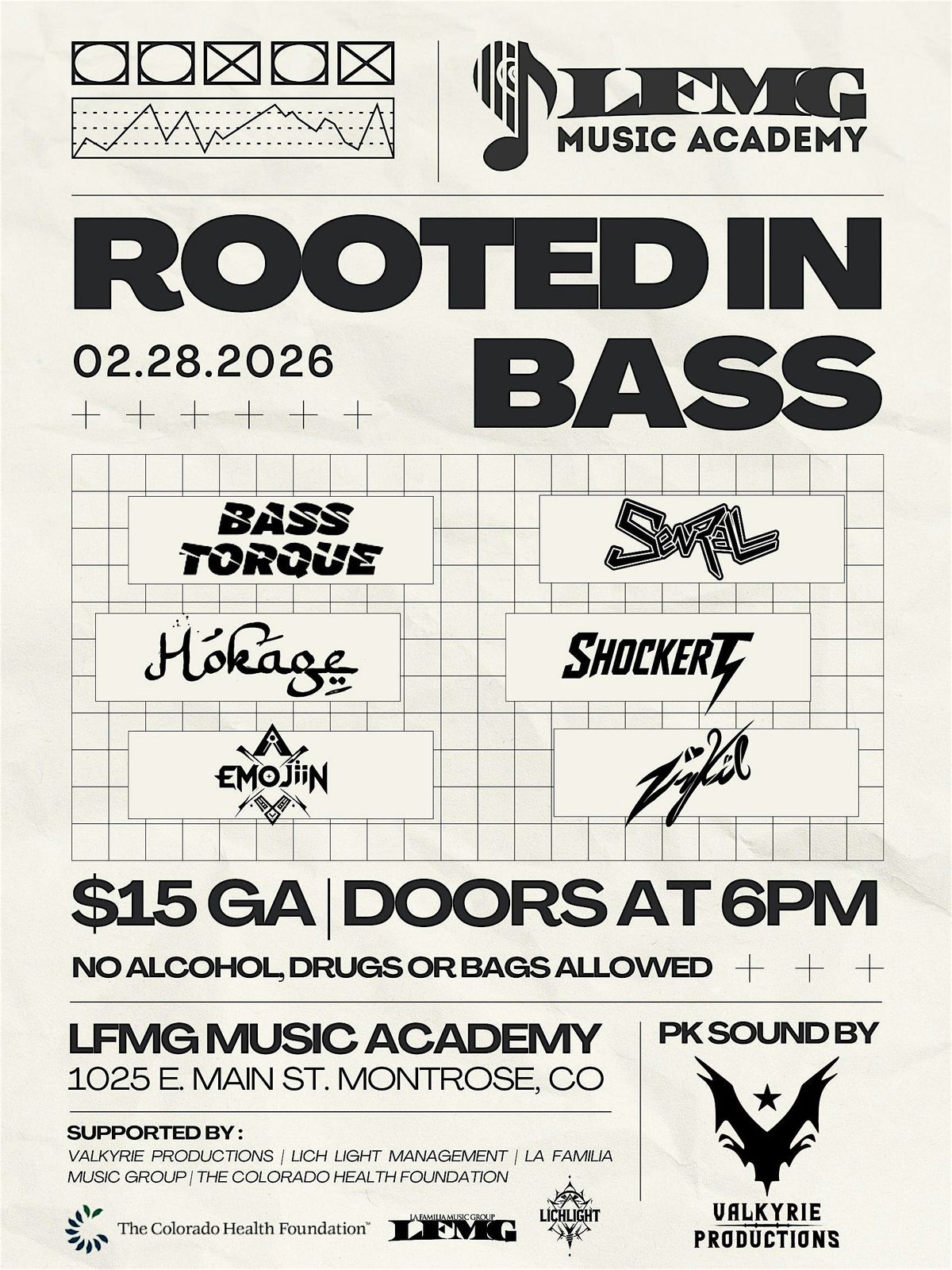 ROOTED IN BASS is an all-ages electronic music fundraiser hosted at LFMG Music Academy in Montrose, Colorado. This high-energy EDM night brings together powerful bass, immersive sound, and a lineup of regional DJs—all in support of LFMG’s mission to inspire youth through music, creativity, and access to the arts.