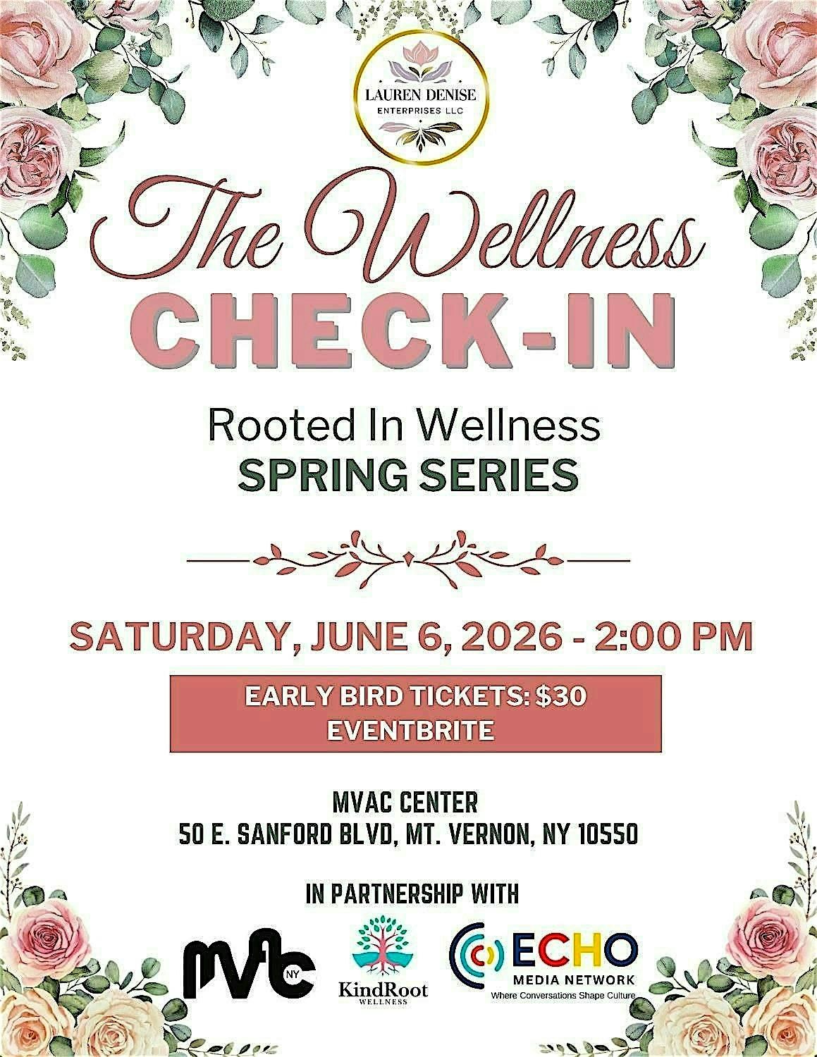 Hosted by: Lauren Denise in partnership with MVAC, KindRoot Wellness, and Echo Media Network, this experience is part of our Spring Wellness Series, created to pour into women who are always pouring into everyone else.