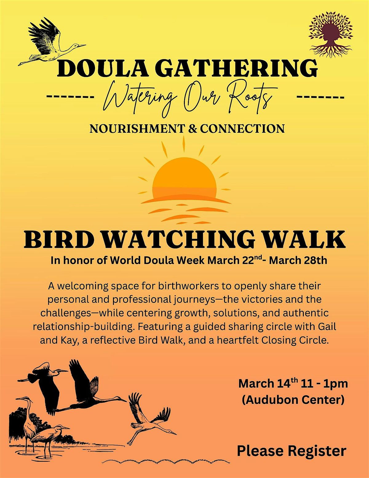 Welcome to the Roots of Wisdom Doula Gathering! Join us at the Nina Mason Pulliam Rio Salado Audubon Center on March 14, 2026 at 11:00 AM (Mountain Standard Time) for a day filled with learning and connection. This event is a wonderful opportunity to meet fellow doulas, share experiences, and gain insights from seasoned professionals in the field. Whether you're a new doula or have years of experience, this gathering is sure to inspire and empower you in your journey. Don't miss out on this enriching experience!