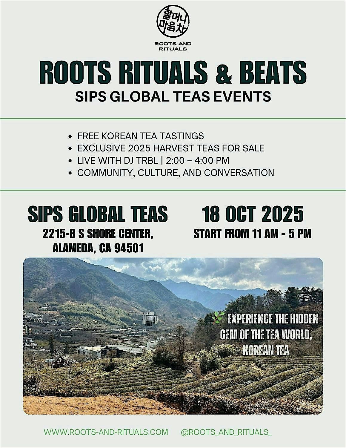 Join Roots & Rituals for a day of tea, music, and community. Explore the 2025 harvest collection with free tastings of three artisanal Korean teas, and shop the full line-up of farm-direct teas available for purchase.
