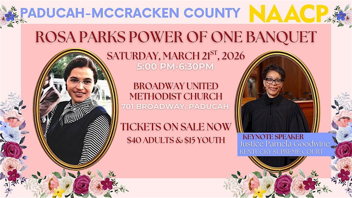 Once again, the Paducah-McCracken County NAACP and Broadway United Methodist church are proud to host the Rosa Parks: Power of One Banquet, Saturday, March 21st, 2026, at 5p.m., in the Fellowship Hall at 701 Broadway St. in Downtown Paducah. Doors open at 4:30p.m.