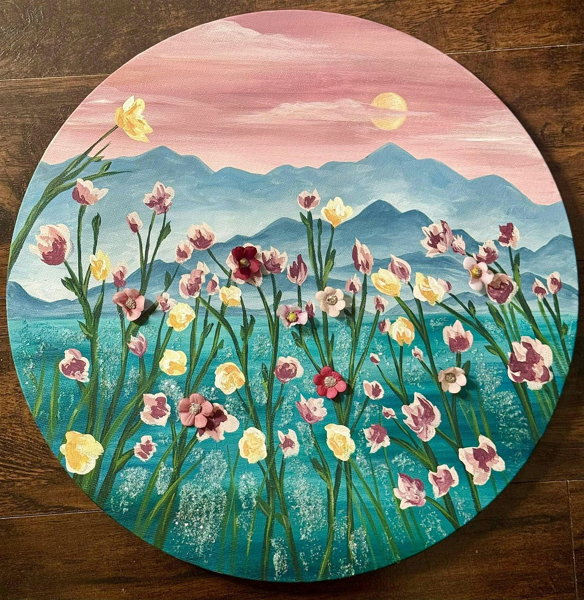 ๐ผ๏ธ One 16" round, wrapped canvas, a variety of paper flowers to choose from, diamond dust and glue for adhering