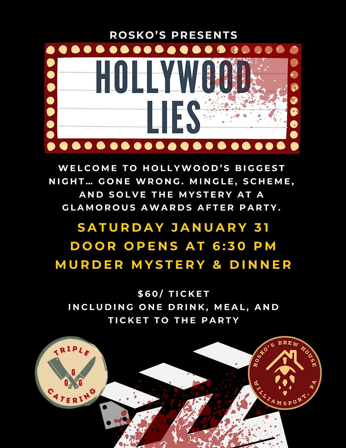 Join us on Saturday, January 31th for a M**der Mystery Event at Rosko's hosted by Party Patty. Doors open at 6:30PM, dinner at 7PM, game begins at 7:30PM. Food will be catered by Triple G Catering, and your meal is included in your ticket as well as (1) drink. Please note: YOU are the characters. Dress the part (if you'd like), and enjoy this fun, interactive game. More information will be emailed prior to the event, but a summary of the premise is below: