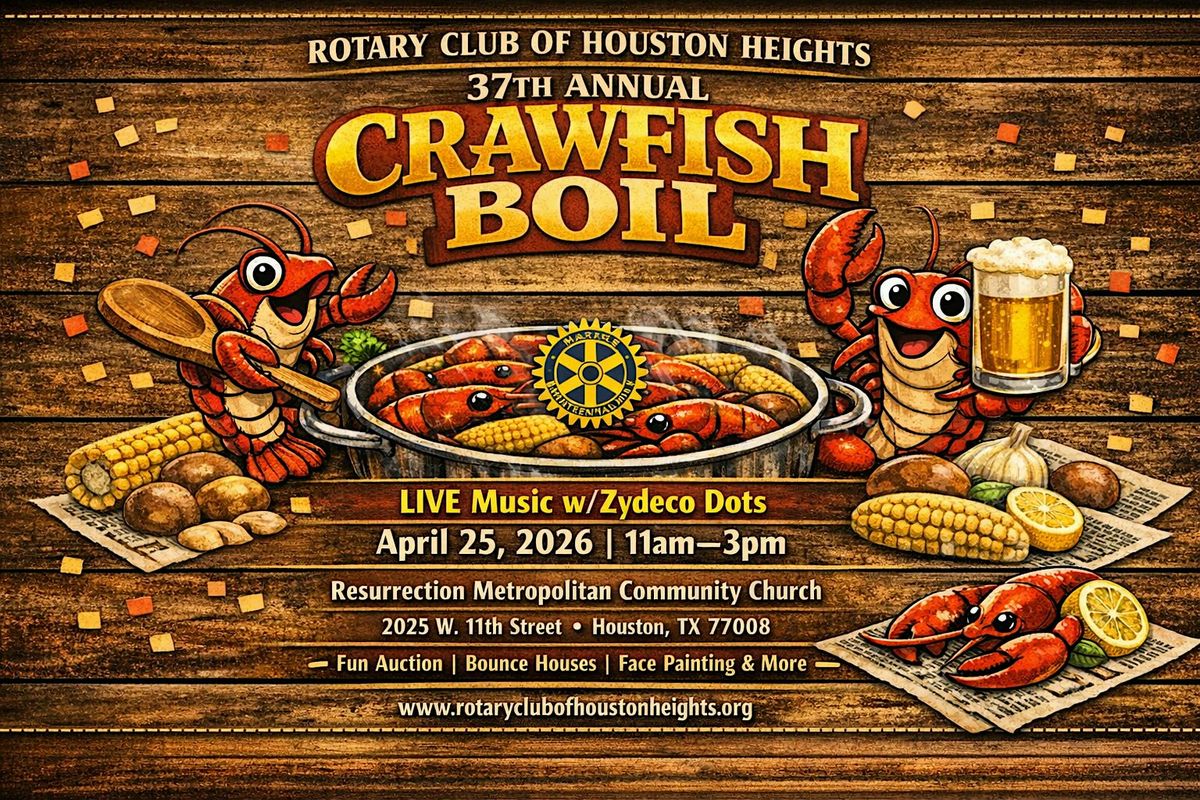 The Rotary Club of Houston Heights proudly invites you to our 37th Annual Crawfish Boil on Saturday, April 25, 2026, at a new location: