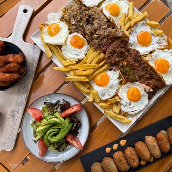 ⭐ Atrévete con los Rotos Cubanos XXL en Madrid: un festín para compartir entre cuatro y dejarse llevar por el sabor. Qué vas a disfrutar 🍽️ Rotos Cubanos XXL: patatas caseras fritas, 8 huevos fritos, carne de cerdo asado al estilo cubano y carne de ternera mechada 🥖 Pan incluido para acompañar como se merece 🥗 2 entrantes a elegir: croquetas caseras, ensalada o fingers de pollo 🍻 4 mojitos 👨👩👧👦 Una experiencia pensada para compartir entre cuatro, perfecta para grupos con hambre de verdad Sabor auténtico del Caribe en pleno corazón de Madrid Información 📅 Horario: 🔹 Lunes a viernes: 12:00 a 23:30 🔹 Sábado y domingo: 10:00 a 24:00 📍 Lugar: La Mulata Latina Plaza, Cost.ª de San Andrés, 16, Centro, 28005 Madrid 👉 Incluye los Rotos Cubanos XXL, 2 entrantes, pan y 4 bebidas Descripción ¿Tienes hambre de verdad y buena compañía? Los Rotos Cubanos XXL llegan a Madrid para convertirse en el plan perfecto para compartir. Con patatas caseras, huevos fritos, carnes cocinadas al estilo cubano y entrantes para abrir boca, esta experiencia es un homenaje al sabor y a la sobremesa. Todo acompañado de pan y cuatro mojitos. Ven a vivir esta explosión gastronómica en La Mulata Latina Plaza y disfruta de un pedacito del Caribe sin salir de la ciudad. ¡Reserva ya y que no falte nadie en la mesa!