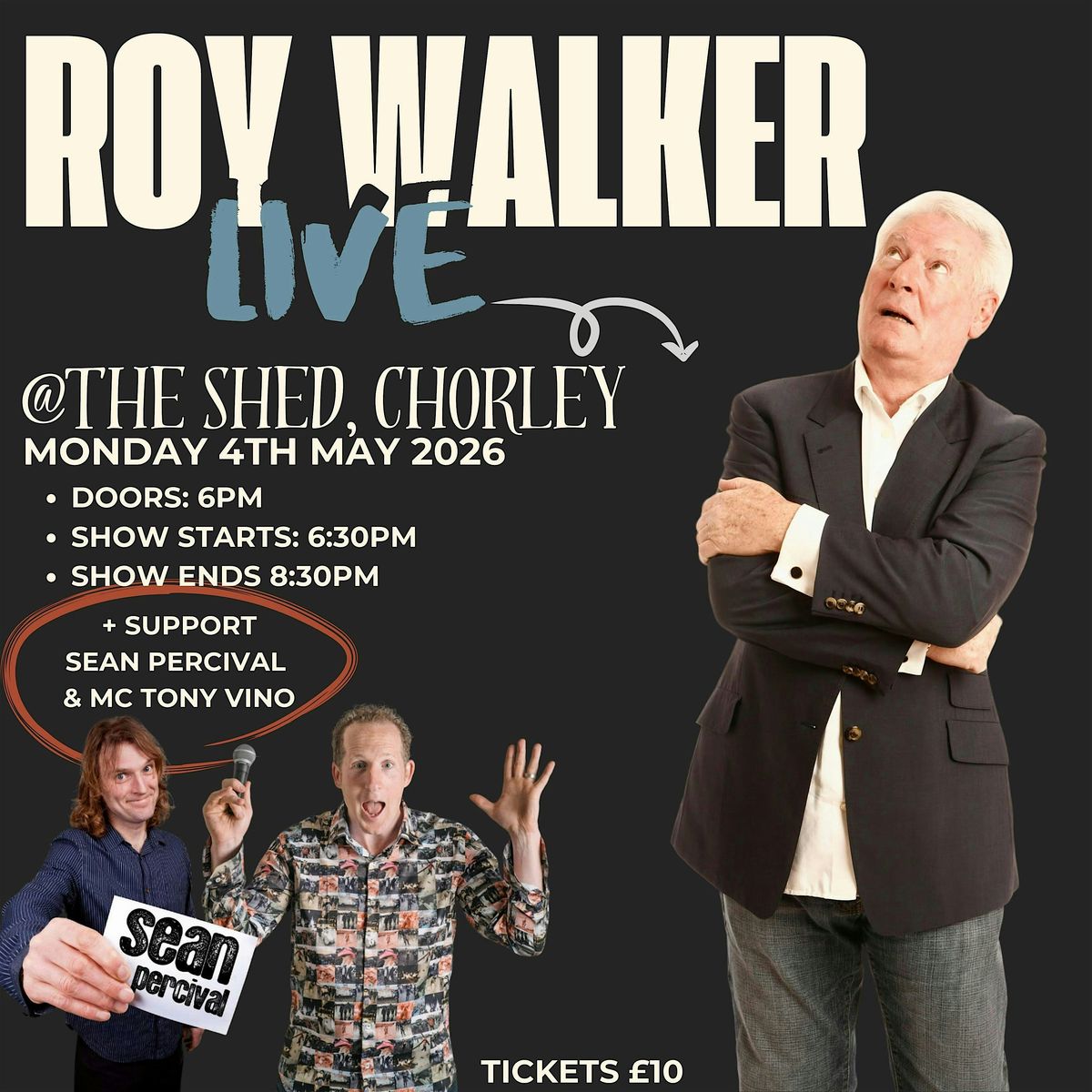 Irish TV Comedy Legend (Catchphrase & The Comedians) Roy Walker is coming to Chroley for one night only. Join him, Sean Percival and MC Tony Vino for an early evening of top comedy and big laughs.