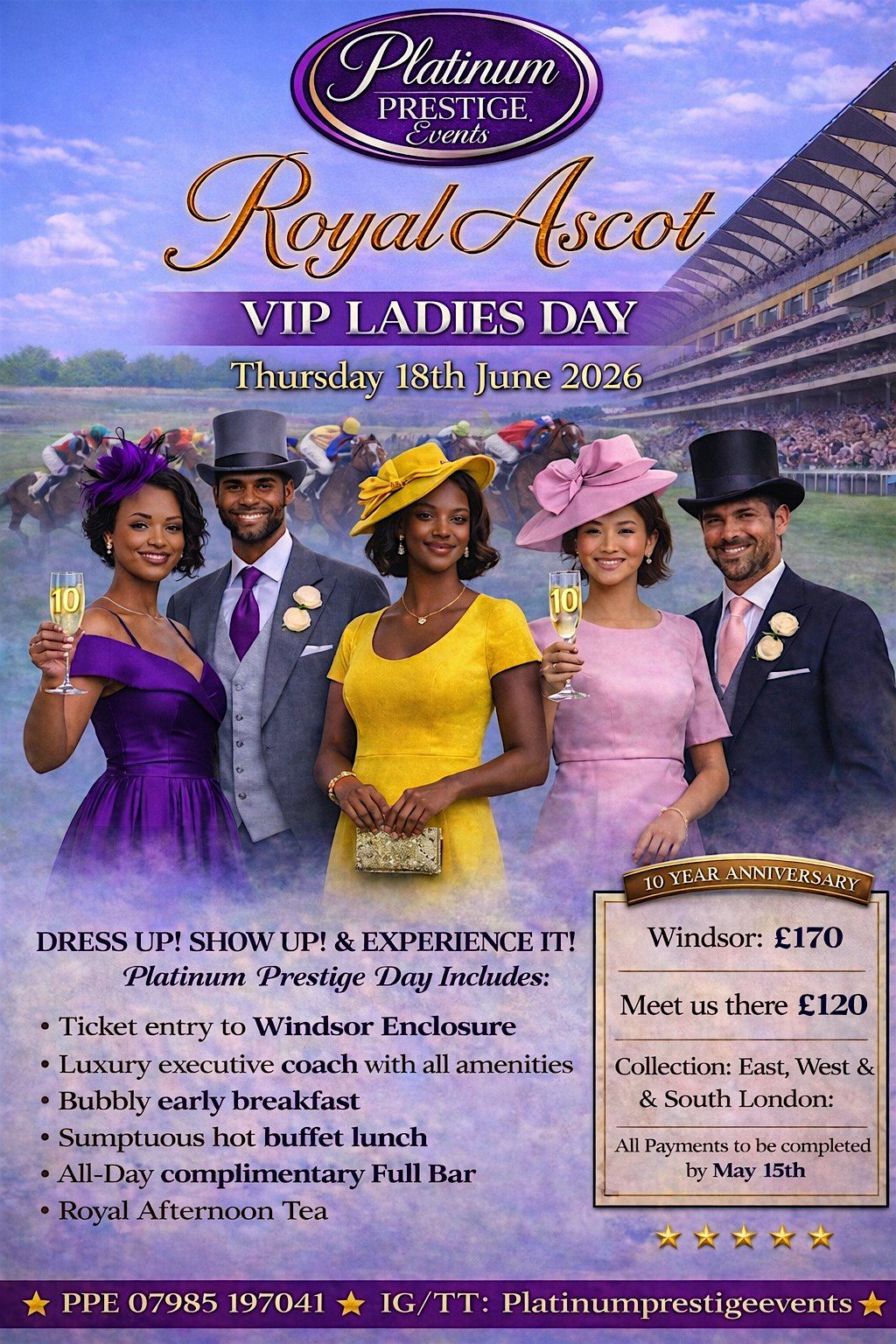 Welcome to the Royal Ascot All-Inclusive VIP Ladies Day at Ascot Racecourse! Join us on June 18th, 2026 at 8:00 AM for a day filled with elegance, excitement, and unforgettable memories. Get ready to dress to impress, enjoy top-notch hospitality to Ascot , including a full breakfast, an extensive buffet lunch, afternoon tea and complementary bar, then witness the thrilling horse races in style.