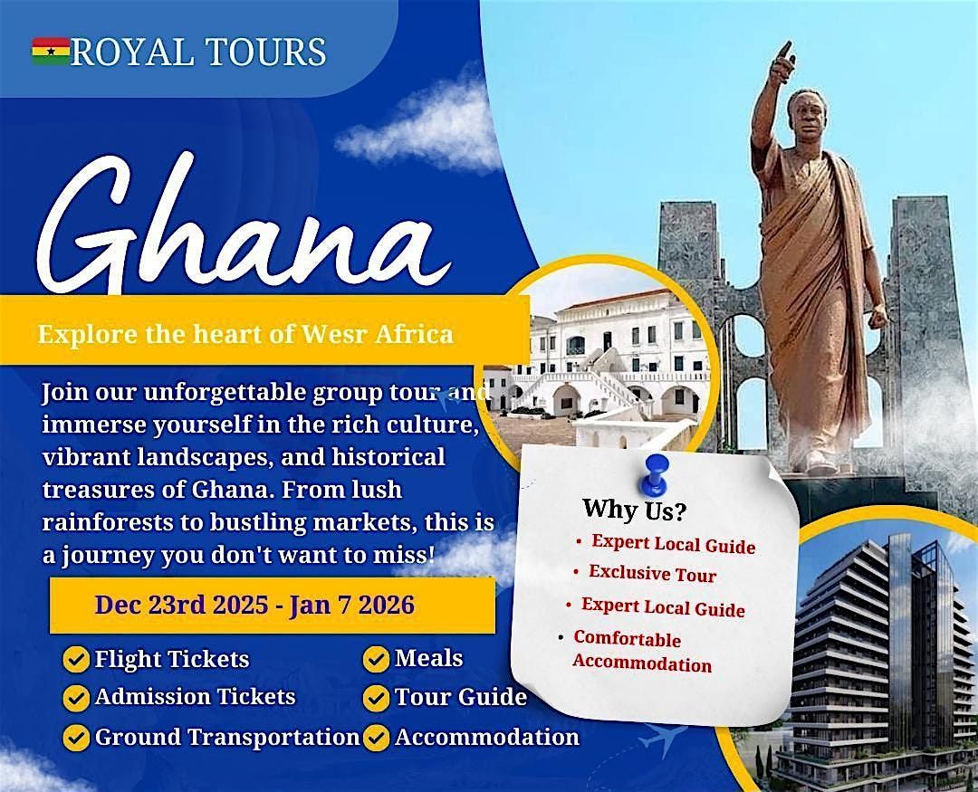 Relaxation at Labadi Beach Hotel / Si Beach– Enjoy the ocean breeze andlocal cuisine Dinner Authentic Ghanaian foods & fine dining • Elmina castle tour Culture welcoming Accra City Tour with Accra City Bus •Aburi & Botanical Gardens Excursion • A TRIP TO VOLTA / Wli waterfall and canopy walkway •Accra to Cape coast • NAMING CEREMONY •NEWYEAR EVENTS •EVENTS A DAY WITH NATURE - SAFARI VALLEY •EXPERIENCE ADA . TREASURE ISLAND •Night life in Accra •Shopping and Relax in Accra