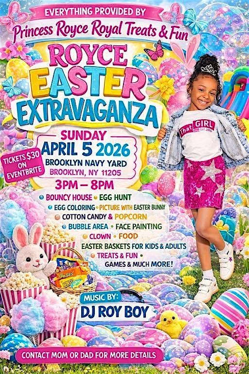 Welcome to the annual **ROYCE EASTER EXTRAVAGANZA**! Get ready for a fun-filled day of Easter celebrations at the Brooklyn Navy Yard. Join us on **Sun, Apr 5th, 2026** at **3:00 PM** (TICKET REQUIRED FOR CHILD AND ADULT!!!) for an exciting event that includes egg hunts, games, face painting, Gift Giveaways and more! Don't miss out on the chance to meet the Easter Bunny and take part in all the festive activities. It's the perfect way to spend Easter Sunday with family and friends. See you there!