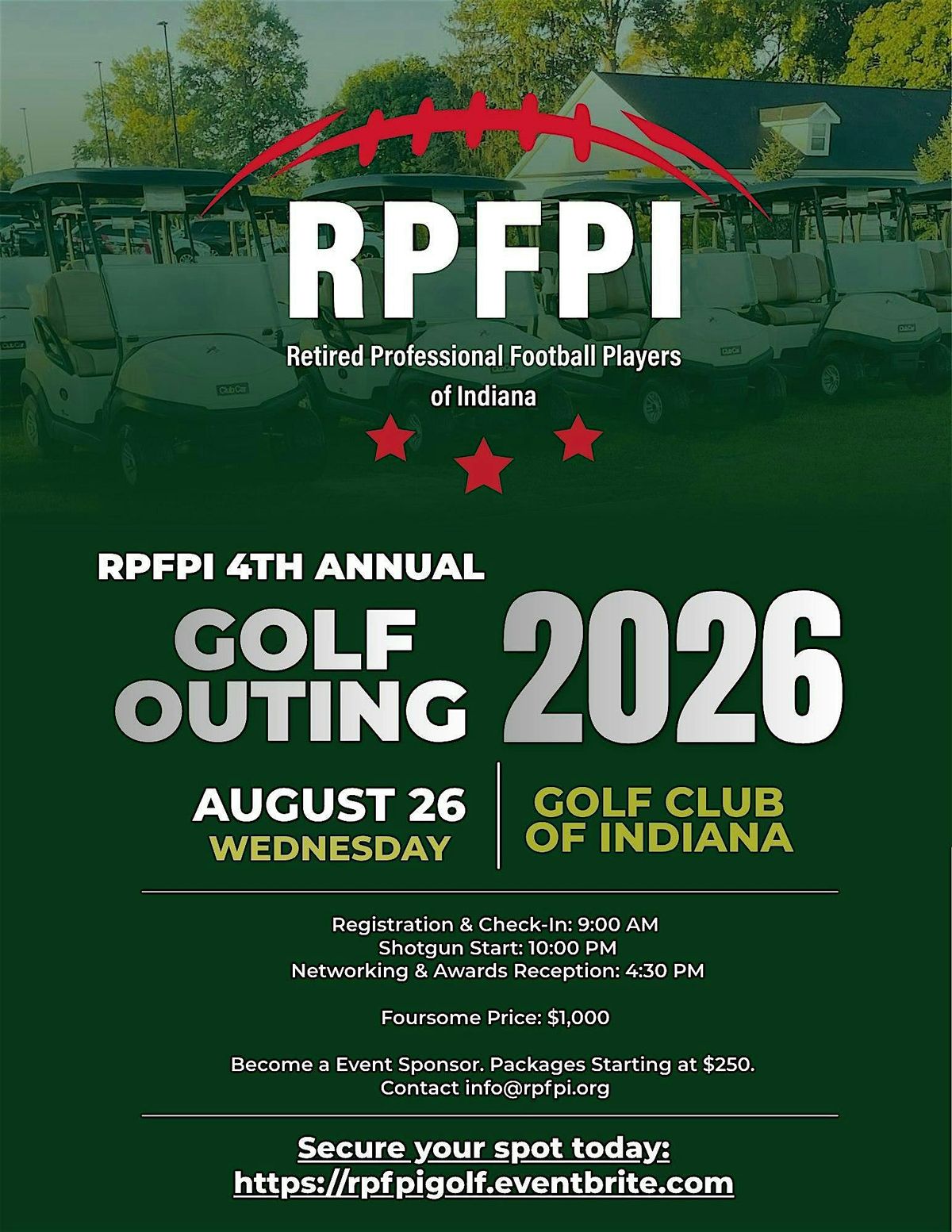 Join Retired Professional Football Players of Indiana (RPFPI) for our 4th Annual Golf Outing on August 26, 2026 at the Golf Club of Indiana.